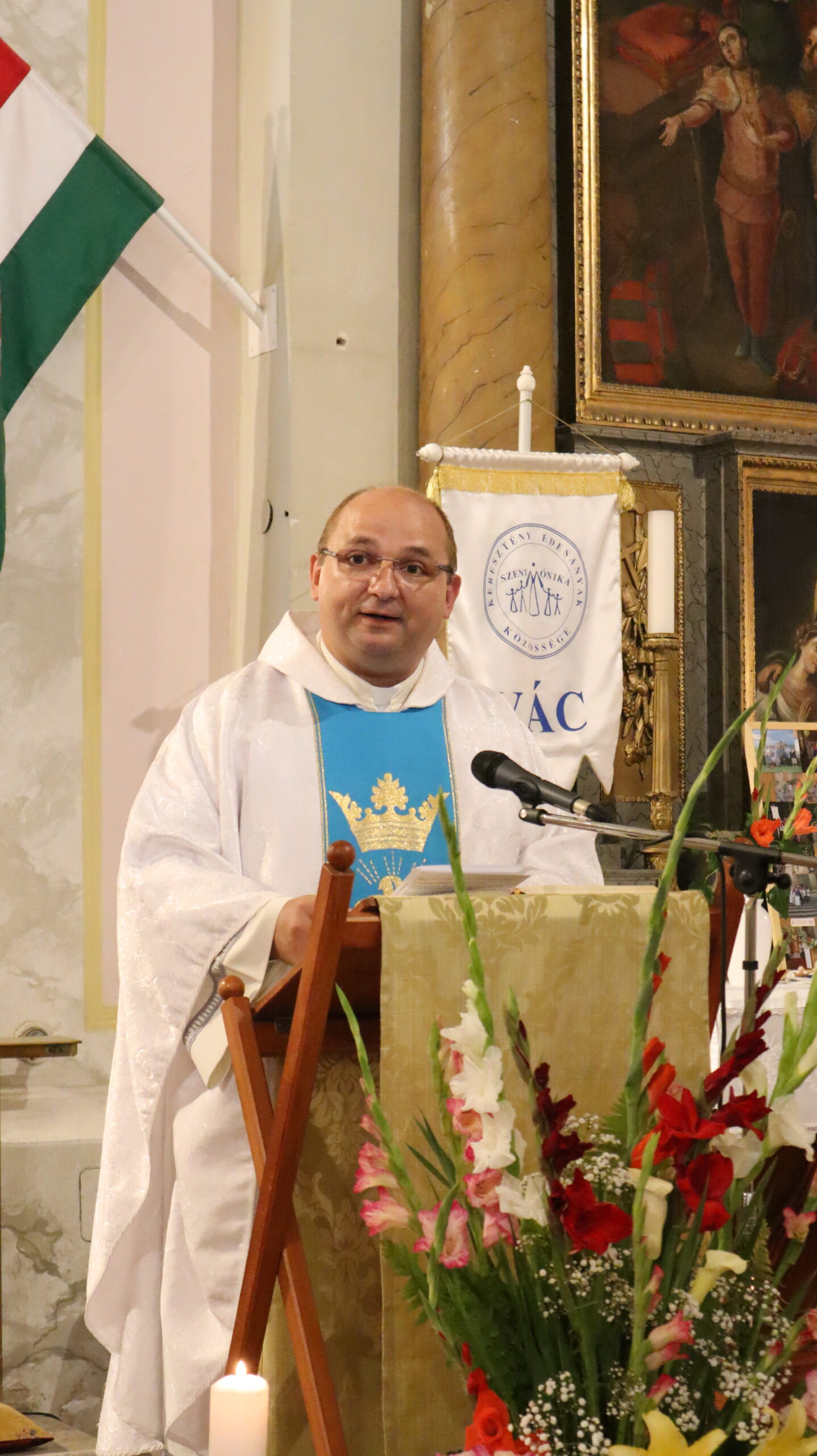 A jubileumi szentmisét Kürtösi Krisztián, paksi plébános, a Szent Mónika közösség országos vezetője mutatta be, és prédikációjában különös hangsúlyt helyezett az édesanyák lelki küldetésére – az anyai vendéglátás lelkiségére. Emellett vendégünk volt Vereckeiné Rajkai Piroska, az országos közösség világi vezetője.