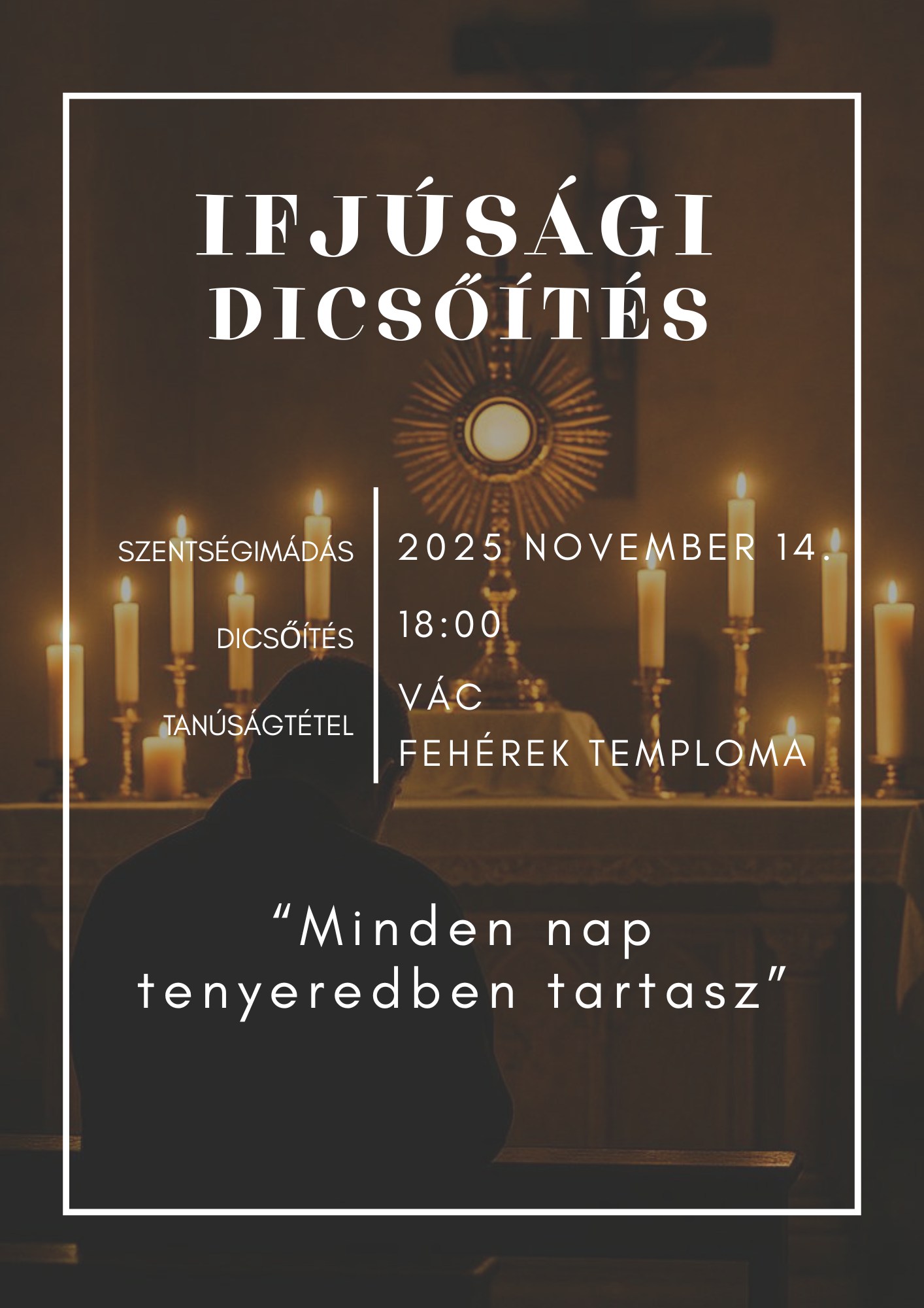 Ifjúsági dicsőítés, szentségimádás és tanúságtétel lesz november 14-én 18 órától a Fehérek templomában, melyre szeretettel várják az érdeklődőket.