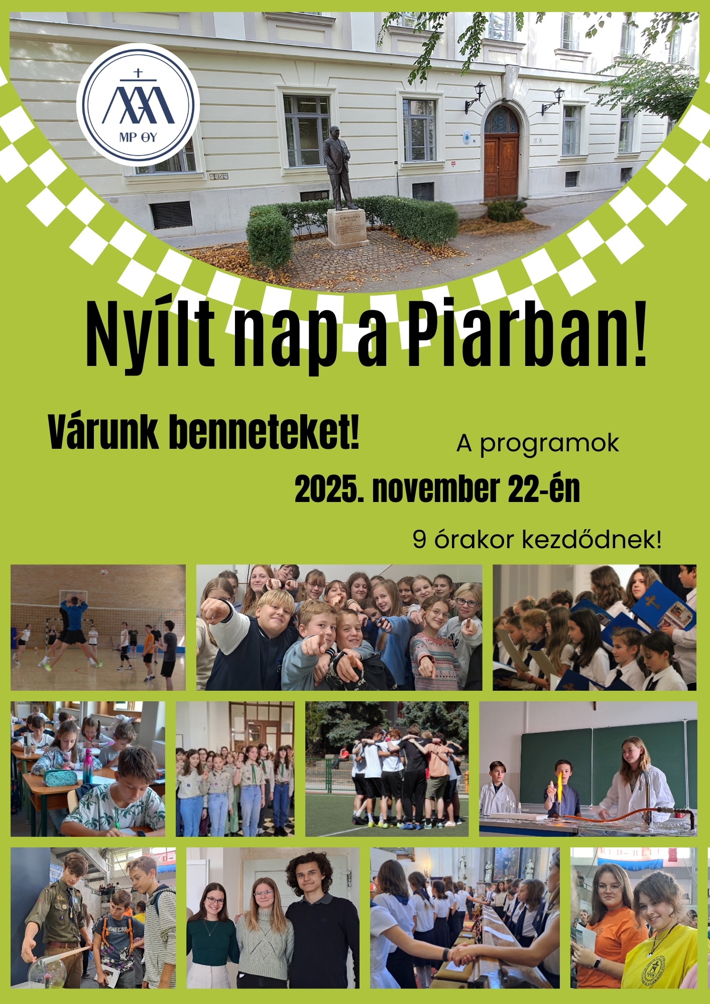Ugyancsak november 22-én 9 órától tartja nyílt napját a váci Piarista Gimnázium. A szombat délelőtti program az egész család számára kínál ismerkedési lehetőséget. Bemutatkoznak az iskola szellemi műhelyei és közösségei, tanárok és diákok egyaránt. További részletek a plakátokon.