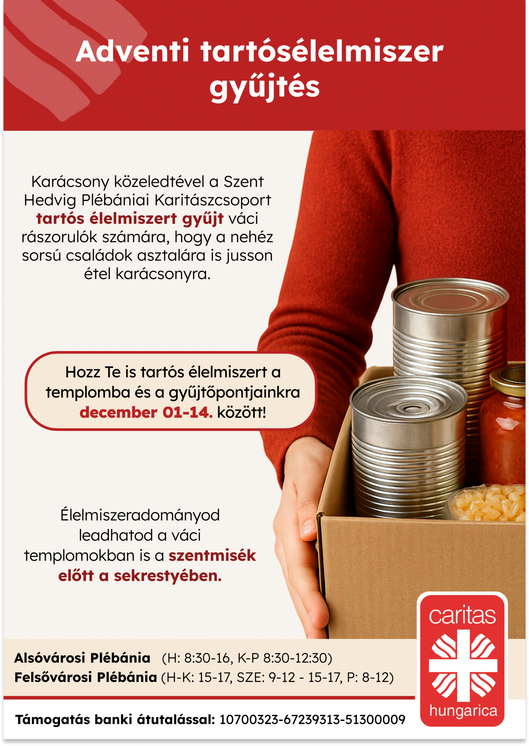 December 1-je és 15-e között tartós élelmiszereket gyűjtenek, amelyekből karácsonyra egységcsomagokat készítenek a legnehezebb helyzetben lévőknek. Az élelmiszereket a sekrestyében a szentmisék előtt és után, illetve a plébániákon hivatali időben lehet leadni.
